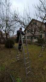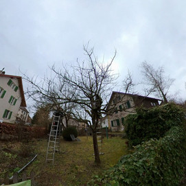 Pünktlich bis zu unserem Treffpunkt um 13.30 Uhr regnete es, dann hatte der Wettergott ein Einsehen. Kaum standen wir zusammen, hörte der Regen auf, und wir konnten unseren dritten Schnittnachmittag trocken und in entspannter Stimmung durchführen. Auf dem Programm standen zwei Gärten im Derendinger Elsässli, in denen mehrere Hochstamm-Apfel-, Zwetschgen- und Kirschbäume in Form gebracht werden wollten.